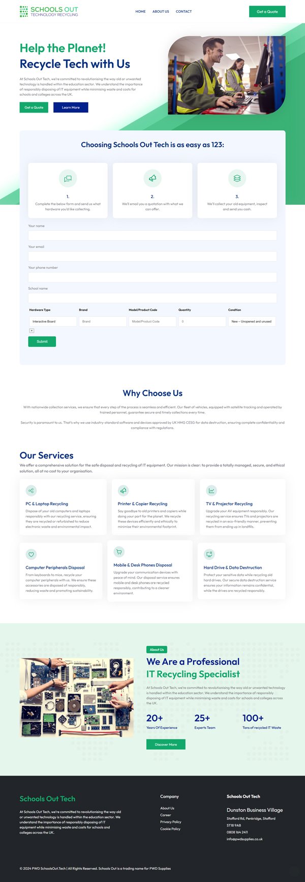 Schools Out Technology Recycling is a forward-thinking initiative that helps educational institutions responsibly recycle obsolete technology—transforming e-waste into meaningful, positive outcomes. For Saif Ur Rehman, the challenge was to design a website that combines professionalism, scalability, user-friendliness, and a strong environmental story.