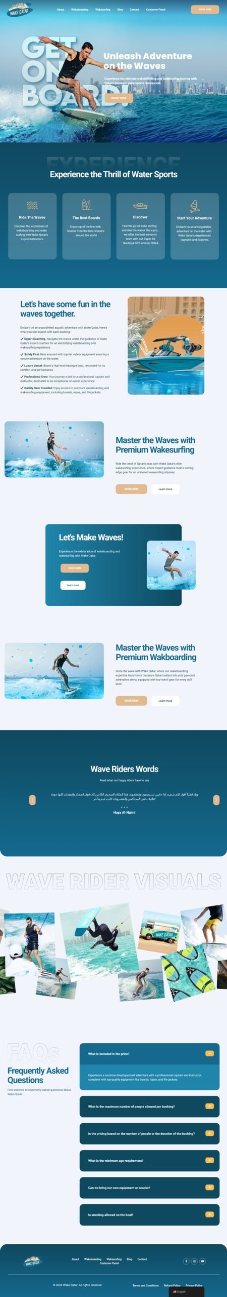 Wake Qatar is a top-tier wakeboarding and wakesurfing destination in Qatar, offering premium equipment, expert coaching, and unforgettable on-water adventure. For Saif Ur Rehman, the challenge was to design a website that conveys thrill, professionalism and clarity—making it effortless for users to discover, book, and engage in an elevated water sports experience.